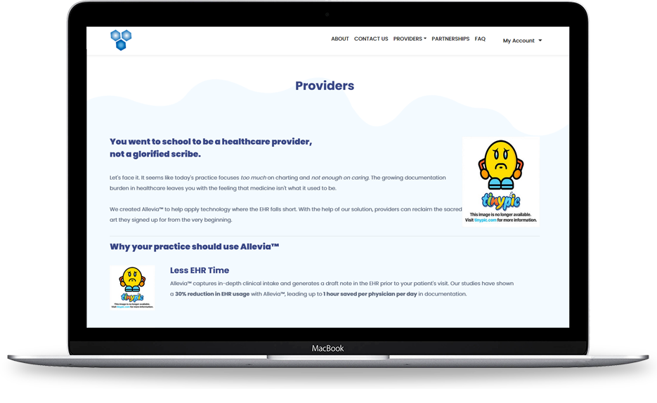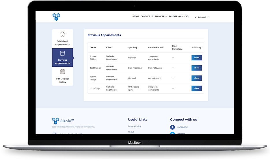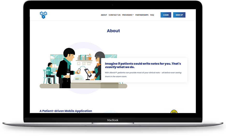 Project Overview Alleviaâ„¢ is a mobile-optimized and cloud-based application that plugs right into your current EHR and patient portal. As soon as an appointment is scheduled within the EHR, patients receive a text message, email, and/or portal notification asking them to fill out your clinic's "Pre-appointment Questionnaire." When patients engage with Alleviaâ„¢ using any device, they are greeted by a fully touch-based, easy-to-navigate user interface. Patients can expect a typical encounter ranging from 5 to 10 minutes.
