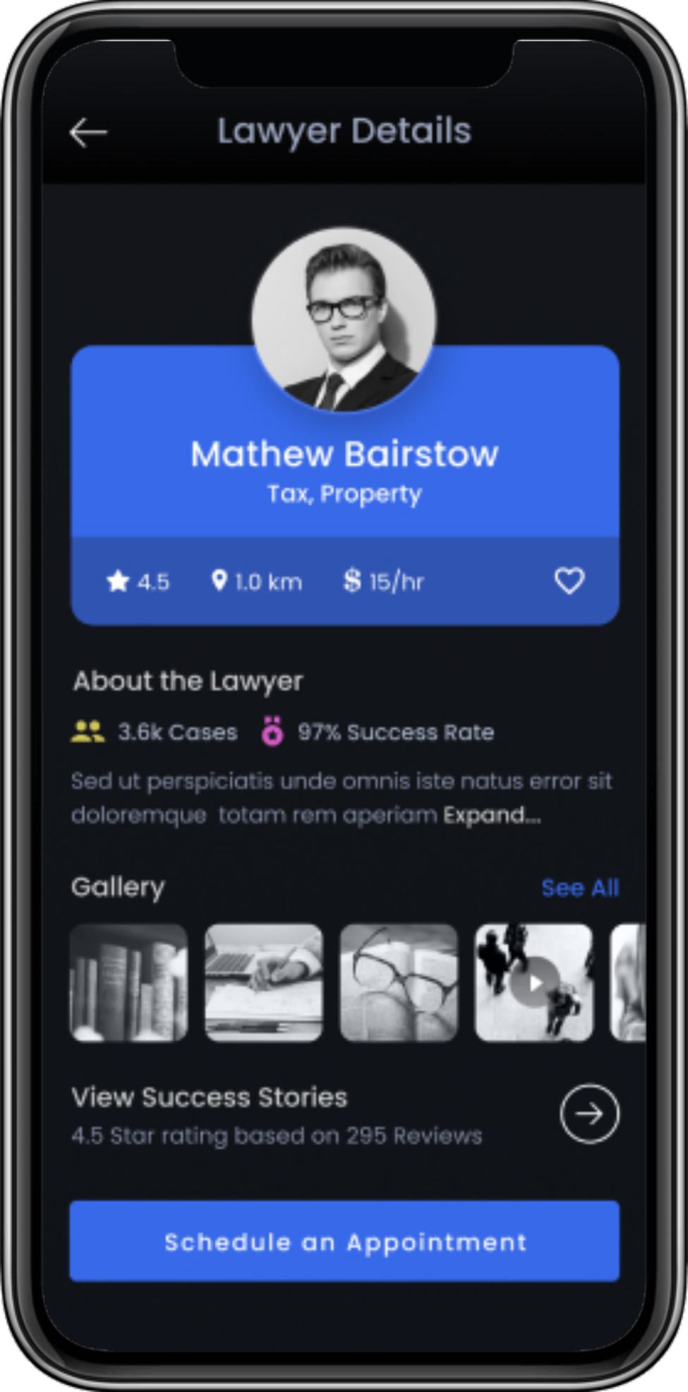 The app is equipped with empowered search filters that facilitate the clients to find a suitable lawyer.