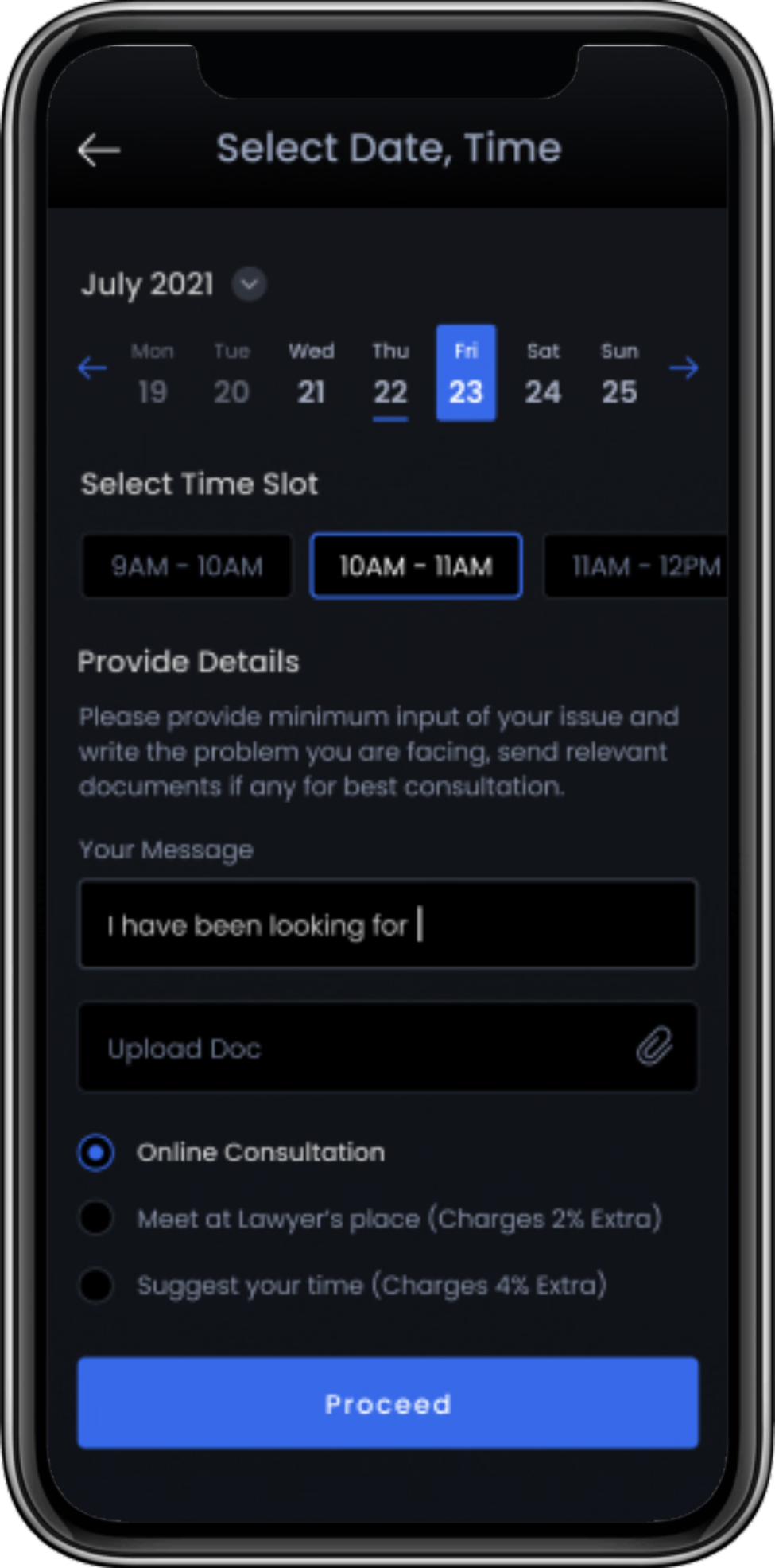 Once the customer goes through the profile and books an appointment with the lawyer, they upload their case details there.